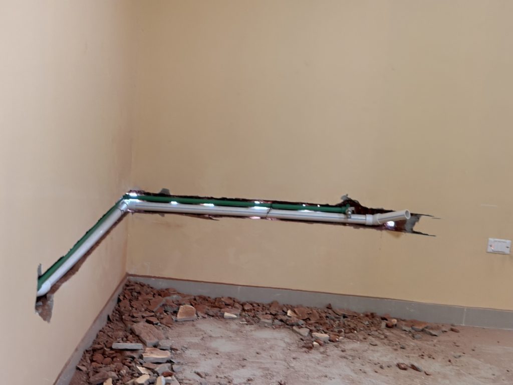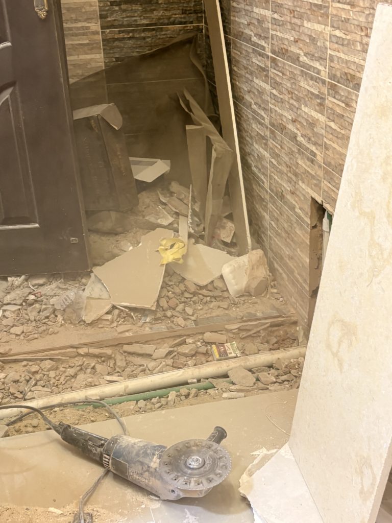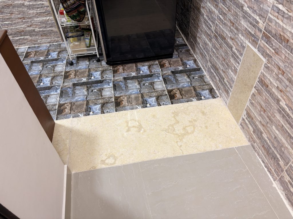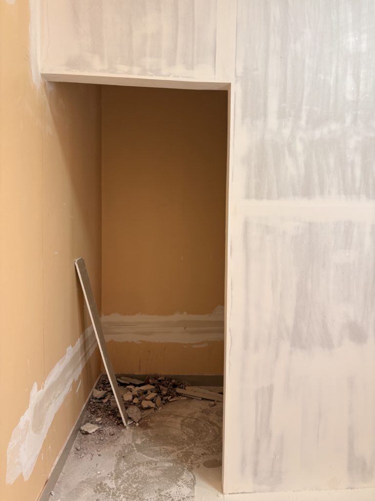 同じタイルを探すのが難しかったため、全然違う色の大理石で蓋をすることになった床と壁とパテで埋められただけの状態の家事室兼納戸の壁の写真です。