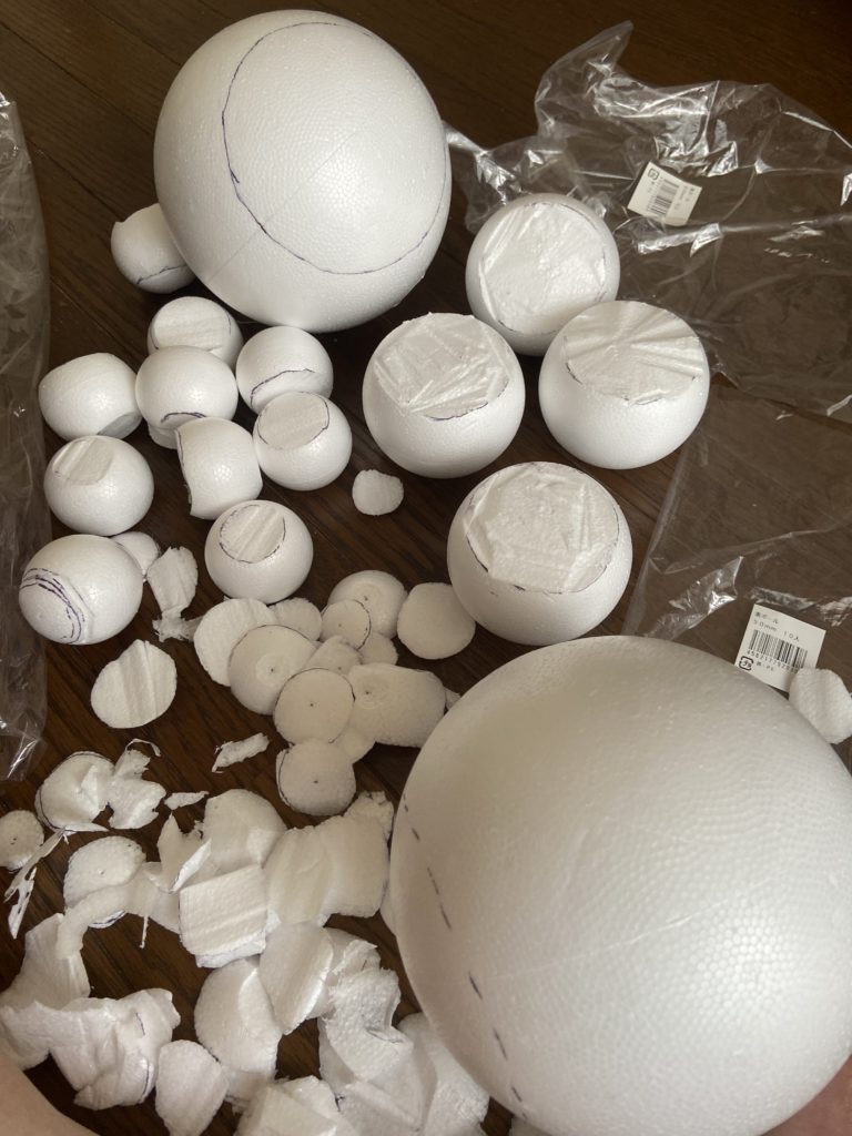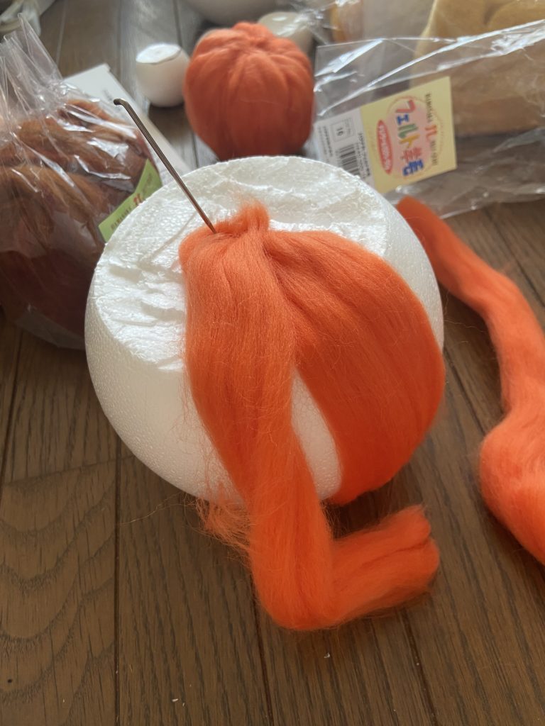 発泡スチロールの玉の上下をカットして、羊毛フェルトを刺して作りました。
