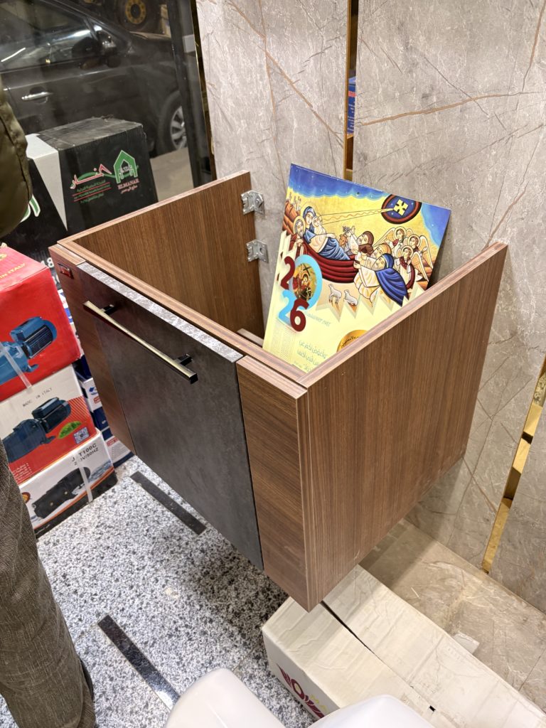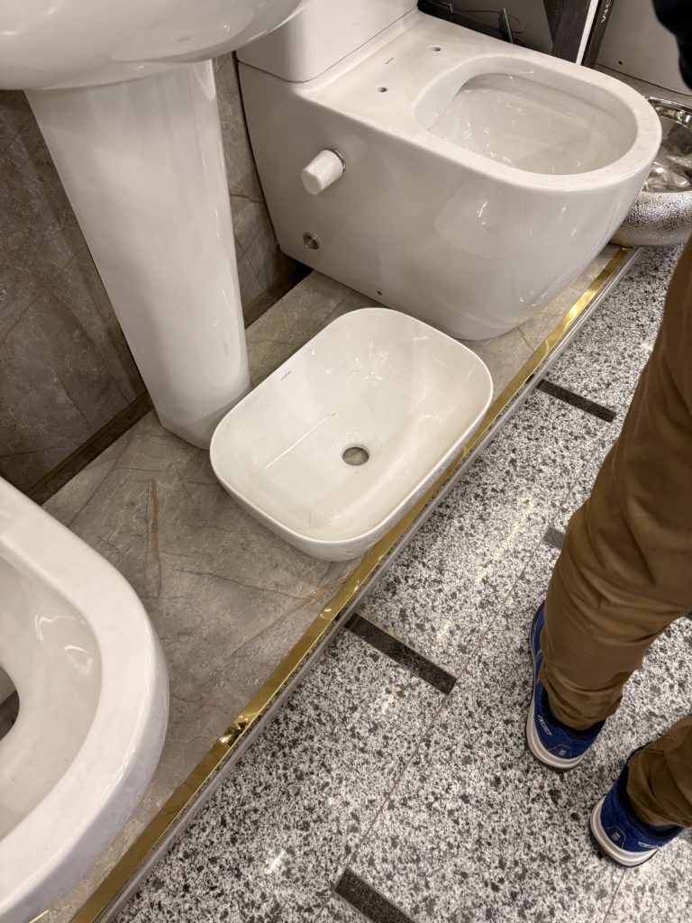 写真はトイレなどを買う予定を聞いていなくて、いきなりお店に連れて行かれて、さぁ選んで!と言われて適当に選んだトイレ本体と洗面台、洗面器。掃除しやすそう・・・で選びました。お店の展示方法にエジプトを感じる。
