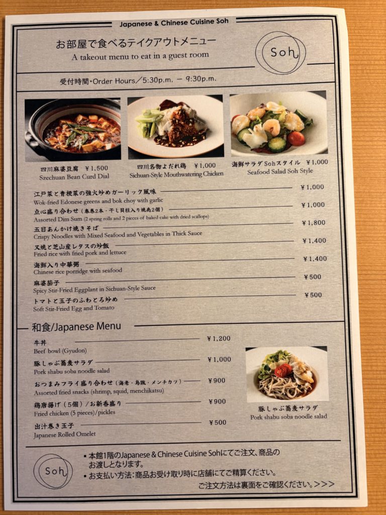 ルームサービスはなく、1階のレストランでテイクアウトができるシステムのようです。(今回は利用せずでしたが、これも気軽でいいかもしれないですね。)