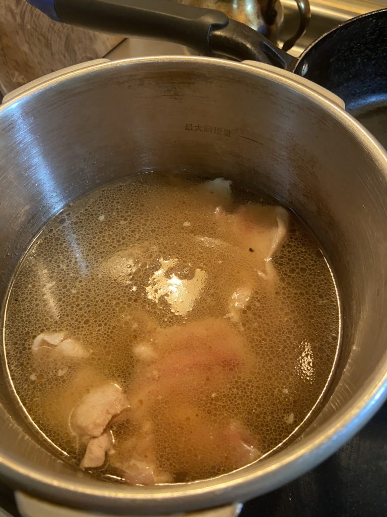 チキンスープの材料を圧力鍋に全部入れて、水を入れます。蓋をして圧力がかかったら弱火にして12〜13分加圧。時間が来たら火を止めて自然とピンが下がるまで放置。