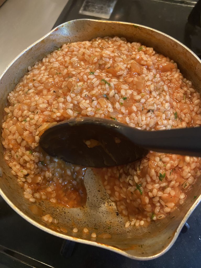 中火でかき混ぜて水分がなくなったら火を止める。火を止めた後もお米が水分を吸い続けるので、少し残ってるかなぐらいで大丈夫です。焦がさない方が大事。この時点でお米が固くても大丈夫です。