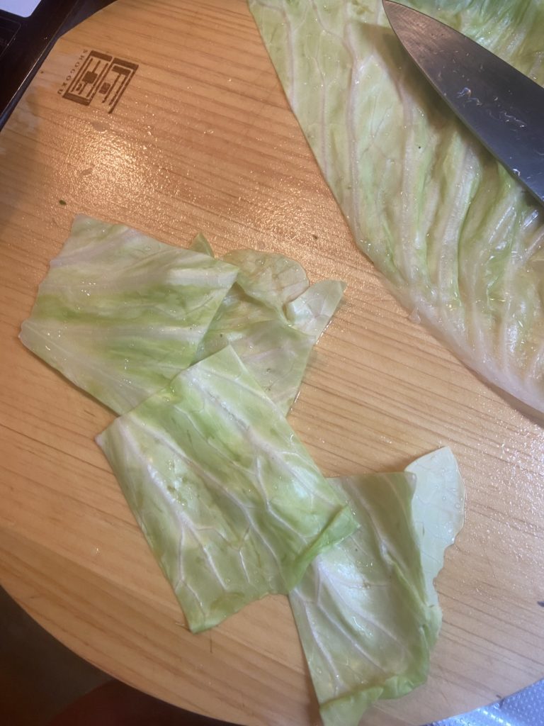 剥がしたキャベツは芯をとって、手のひらよりちょっと小さいくらいの四角くなるようにカットする。