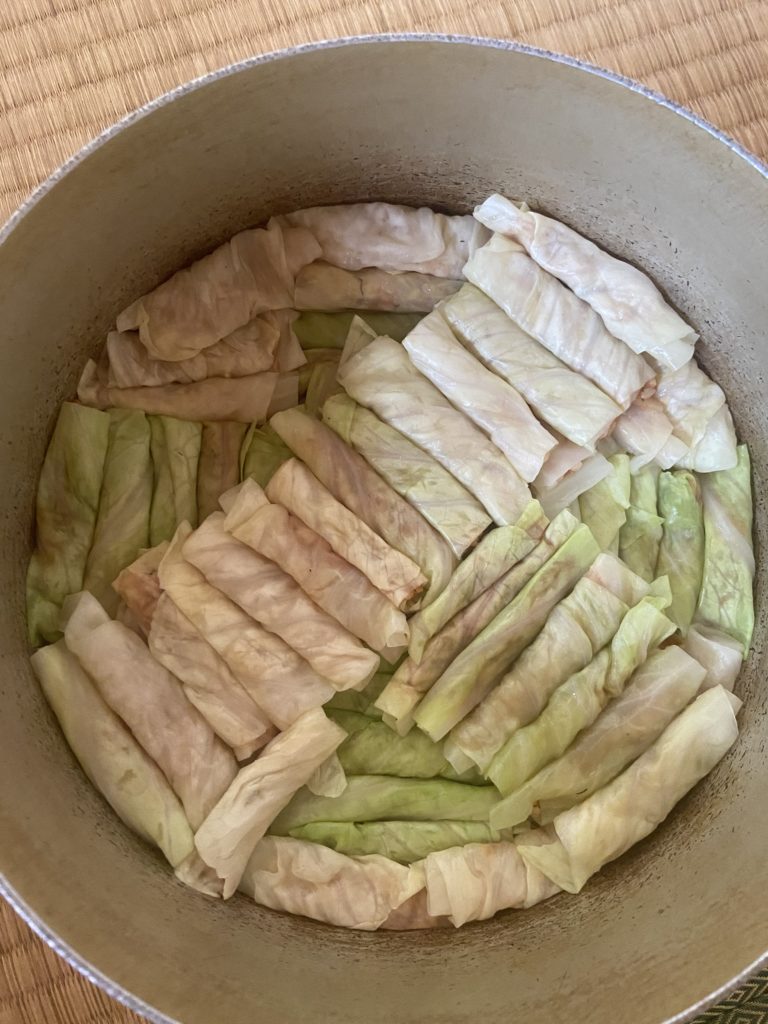 鍋の底に刻んだキャベツの芯を敷いて(焦げつき予防)、その上にキャベツのマハシを引き詰める。今回は5段積みました。煮ている間に動かないように隙間なくぎゅうぎゅうに詰めた方がいいです。動くと中のお米が出てきてしまい、キャベツのマハシではなく、キャベツと味付けご飯(バラバラ)になってしまいます。