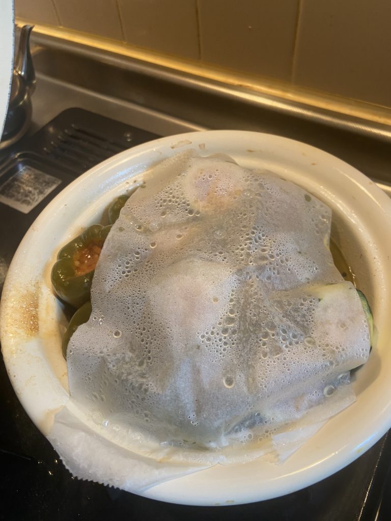 ピーマンはフィーリングを使い切るための調整も兼ねているので、キャベツとズッキーニにフィーリングを巻いたり、詰めた後で残りのフィーリングの量を見ながら何個用意するか決めてください。