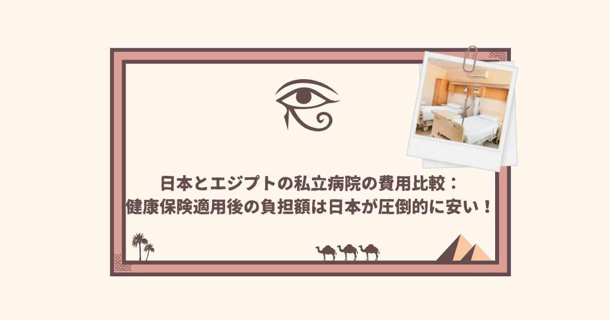 エジプトの私立病院で全額自己負担で治療を受ける場合、費用は日本に比べて安いですが、日本の健康保険適用後の自己負担額は、エジプトの医療費と比較しても圧倒的に安いことがわかります。
