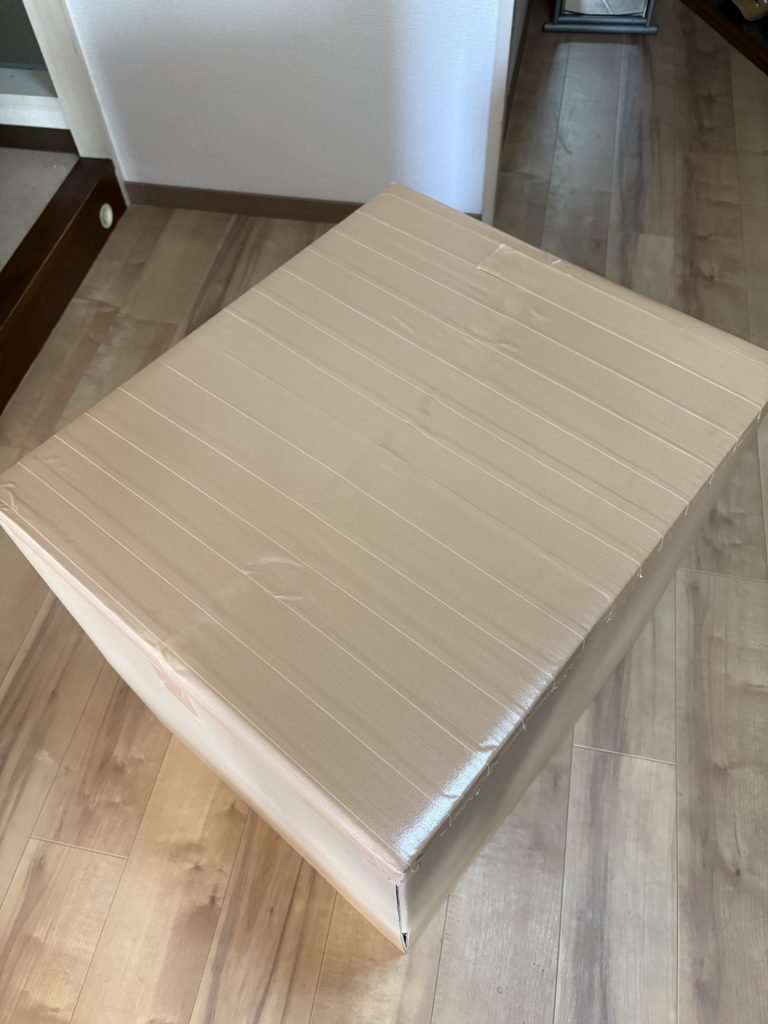まず、ダンボールの底面に十字貼りします。加えて隙間を塞ぐため折り返し部分の両端も布テープを貼ります。