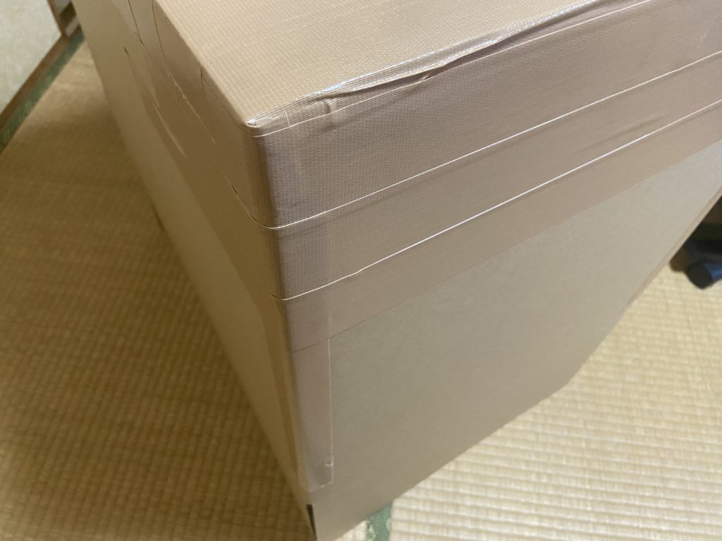 入口以外の5面が布ガムテープで、角強化プラス側面保護ができたら、その上から梱包テープ(OPPテープ)を5面全部に貼ります。