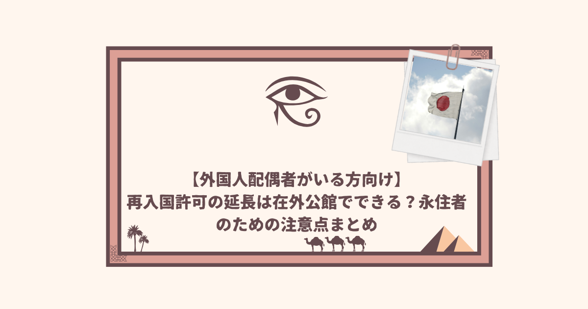 まず確認しておきたいのは、永住者資格(在留資格)そのものは海外では延長・更新できないという点です。しかし、入国管理局で発行された「通常の再入国許可(最長5年)」が有効である場合に限り、その許可の有効期間を在外公館で最大1年間延長することが可能です。